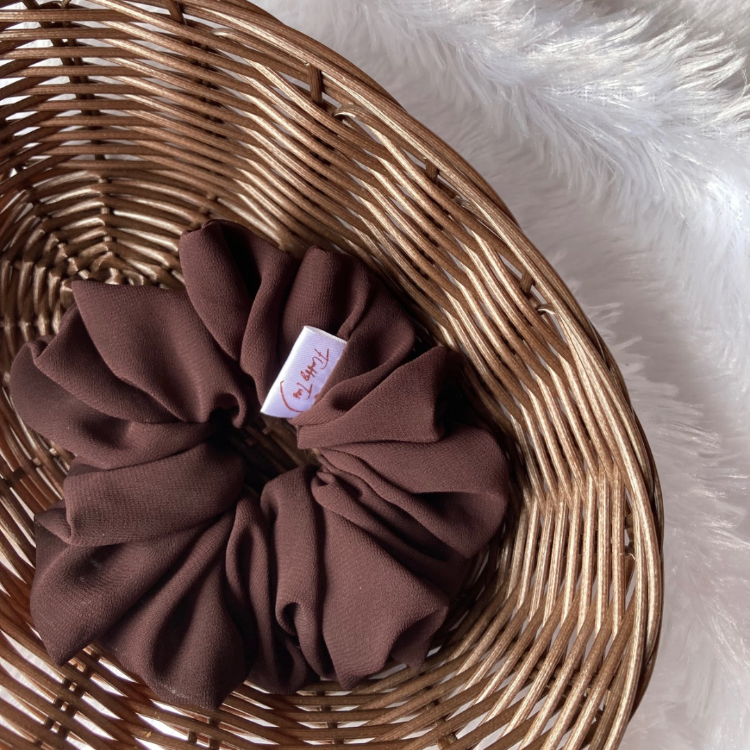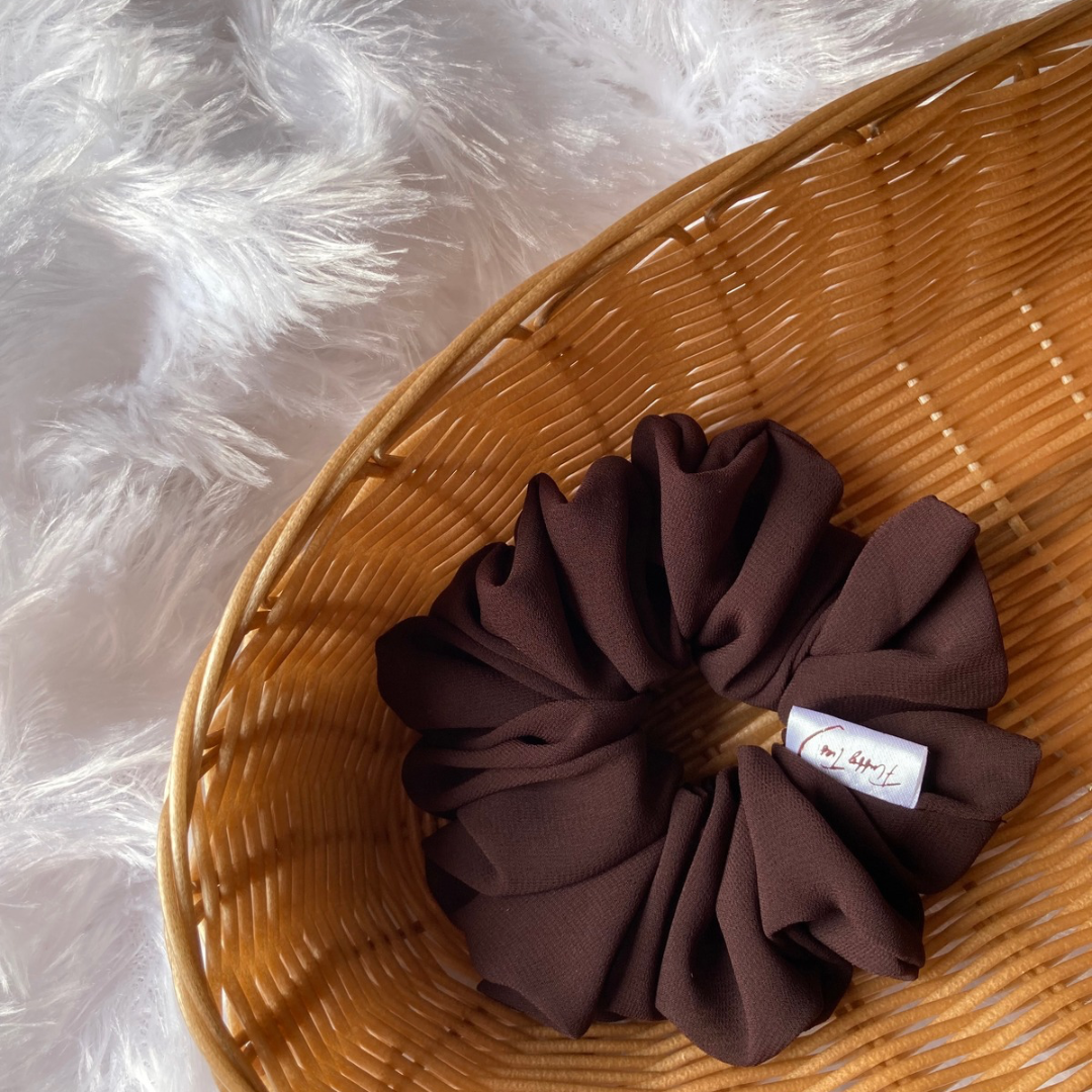This rich espresso-hued georgette scrunchie is your daily caffeine fix — for your hair. The soft, flowy fabric adds an effortless flair, while the deep brown tone brings cozy elegance to even the simplest hairstyles.